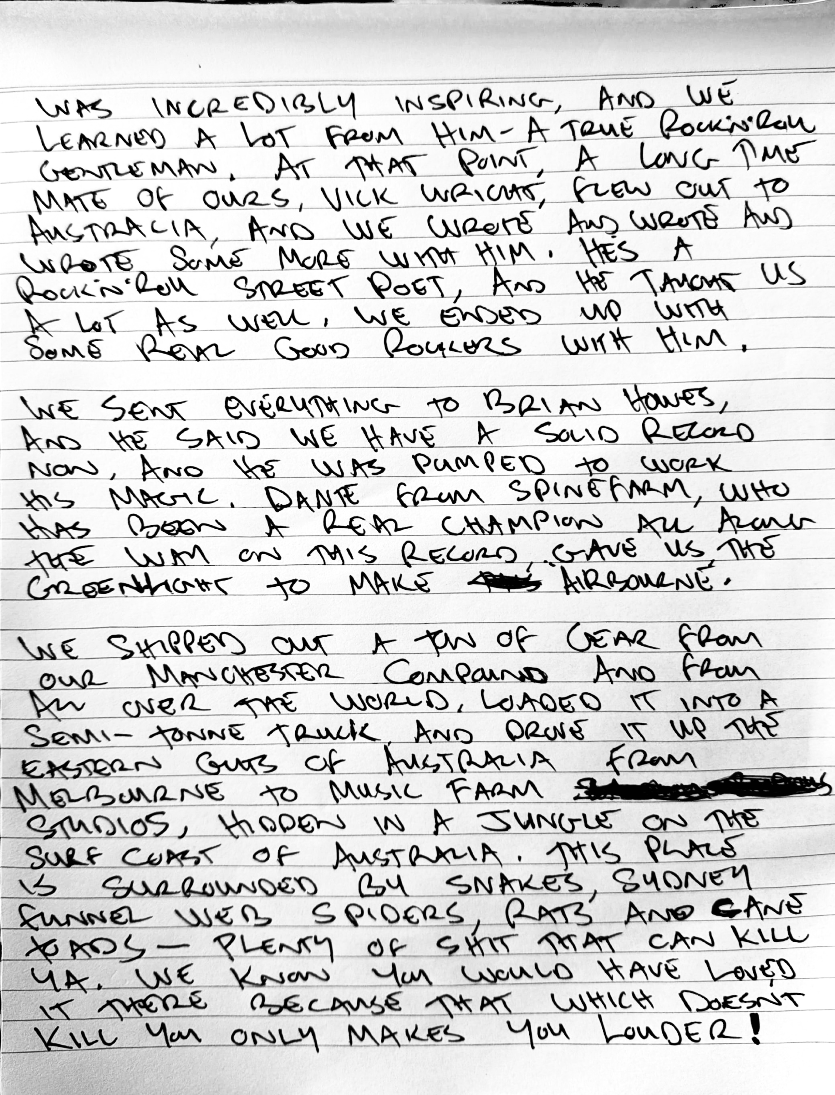 »Es ist lange her, seit wir uns zuletzt begrüßten oder eine Bühne teilten. Was wir aber nie vergessen haben ist ein Satz, den du uns damals mit auf den Weg gegeben hast: „Egal was ist, bleibt euch treu. Schert euch nicht um den Scheiß, der in der Musikindustrie abgeht, sondern macht Musik, die eure Roadies mögen. Niemand hat eure Songs häufiger gehört wie sie — und wenn sie es mögen, dann werden es alle anderen lieben.“ Wir haben genau das getan, Kumpel!«, so die Eröffnung des Briefes, in dem die Band von der Entstehung ihres neuen Werkes Airbourne berichtet. Und der unten in handgeschriebener Form gänzlich einsehbar ist