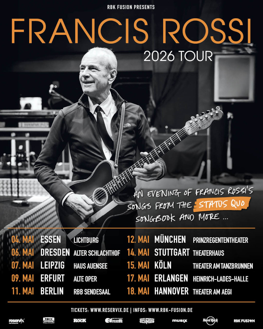 The Accidental erscheint am 30. Januar 2026. Ab Anfang Mai ist Rossi dann auf Deutschland-Tour: Im Rahmen seiner An Evening Of Francis Rossi's Songs Fromt The Status Quo Songbook And More...-Rundreise, einer Mischung aus Akustik- und Spoken Word-Show, wird er hierzulande in zehn Städten zu sehen sein. Alle Termine sind unten zu finden.