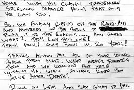 »Es ist lange her, seit wir uns zuletzt begrüßten oder eine Bühne teilten. Was wir aber nie vergessen haben ist ein Satz, den du uns damals mit auf den Weg gegeben hast: „Egal was ist, bleibt euch treu. Schert euch nicht um den Scheiß, der in der Musikindustrie abgeht, sondern macht Musik, die eure Roadies mögen. Niemand hat eure Songs häufiger gehört wie sie — und wenn sie es mögen, dann werden es alle anderen lieben.“ Wir haben genau das getan, Kumpel!«, so die Eröffnung des Briefes, in dem die Band von der Entstehung ihres neuen Werkes Airbourne berichtet. Und der unten in handgeschriebener Form gänzlich einsehbar ist